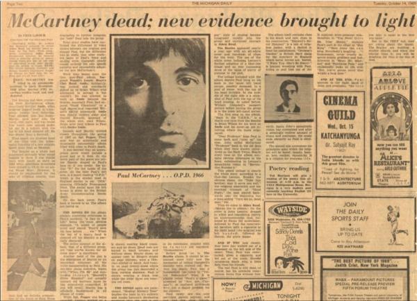 In September 1969 it was rumoured that Beatle Paul McCartney had died in 1966 and was secretly replaced by a look-alike. The conspiracy gained further interest following reports on American college campuses and soon spread around the world after it was featured by a DJ on his late-night talk show.